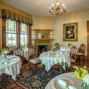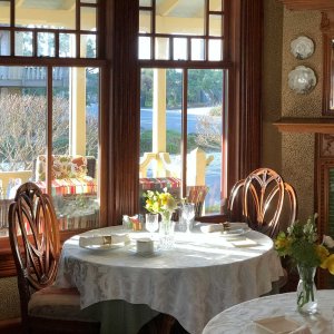 Walls shimmer in hand-screened wallpaper of subtle gold and green leaves and the mirror above the working fireplace reflects the Regency chandelier. The niche is papered in an elaborate Japanese lattice print, framing the Victorian marble-topped sideboard and etched ruby glass lamps. Period paintings grace the walls. You can enjoy your breakfast here or on the adjoining wrap-around porch; your morning coffee cooled and your appetite whetted by ocean breezes.