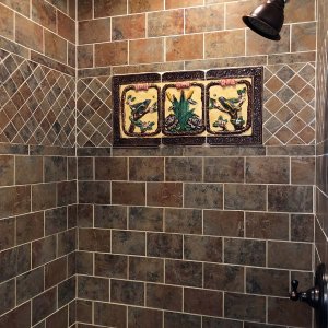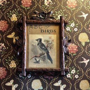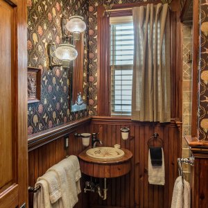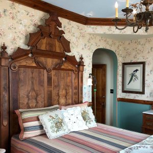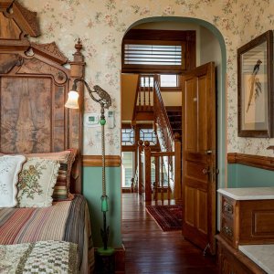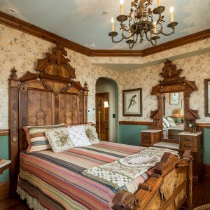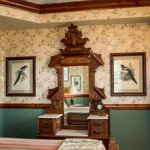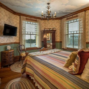 Ocean views under a hand-painted sky ceiling, the Aviary charms with a dramatic ceiling-high Victorian headboard over a queen-sized bed. Furnished with a matching vanity, and a mirrored armoire stacked with quilts. Softly hued florals and birds wallpaper, a bronze chandelier with birds nesting among its branches, and antique ornithology prints complete this flight of fancy. The cozy private bath features an English transferware sink and intricately tiled shower that is reminiscent of a ship’s cabin. All rooms include WiFi.