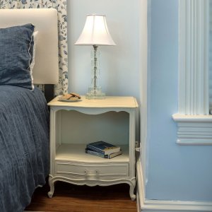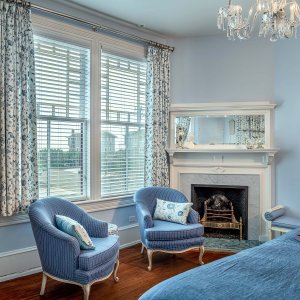 Elegance and the ocean, the king-sized bed faces windows with ocean views. Inspired by those views, the Blue Room is a sea of blue and white toile drapery, antique mirrors, mercury glass, and crystal sconces, chandeliers and lamps. Comfortable chairs flank the original tiled fireplace so you can sit back and relax in luxury.