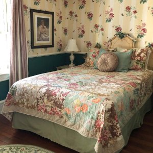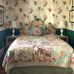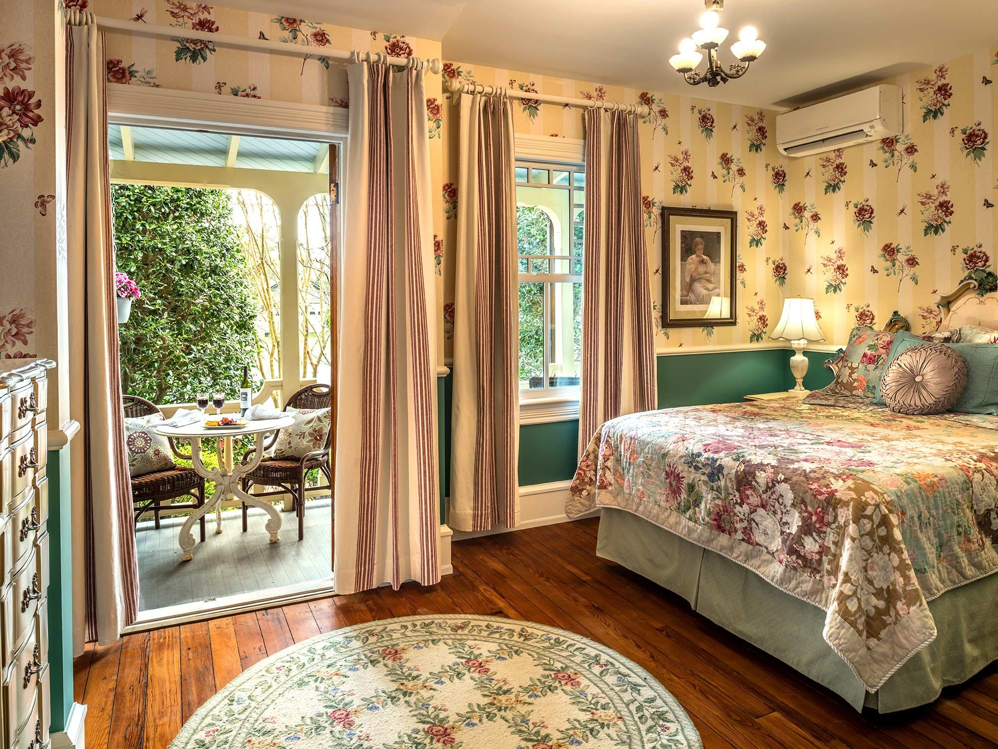 Your own secret getaway, the Garden Room leads to a landscaped private veranda with table, chairs, and cushioned seating. Perfect for relaxing with wine, cheese, and a good book. The room itself is decorated in sophisticated floral wallpaper, antique botanical prints, a queen-sized bed with hand-painted Italianate headboard, and a floral slipper chair.