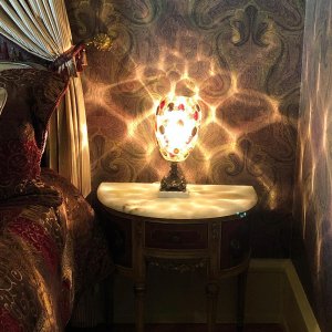 Inspired by Viennese Art Nouveau artist Gustav Klimt, the Opulent Room is a jewel-toned fantasyland. A queen-sized curtained French bed is overhung with a brass mirror, and glittering bedside lamps, Klimt prints, and gold draperies surround you. A black and gold chandelier glows against a golden ceiling and richly patterned walls. Opulent indeed!